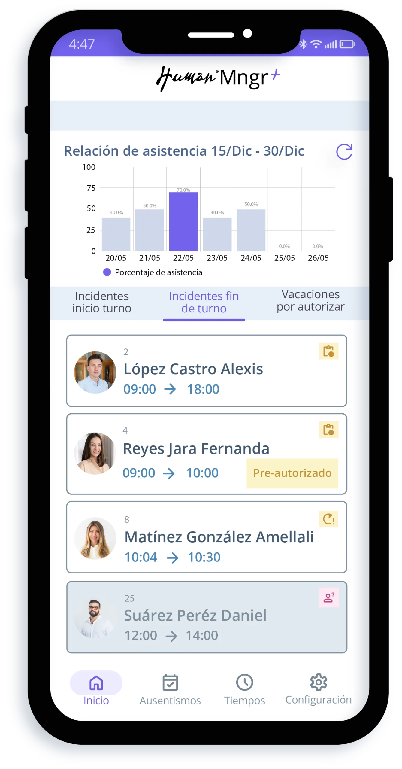 - Supervisión en movilidad: Autorización de incidencias, permisos y horas extra directamente desde el celular mientras se recorre la planta.
